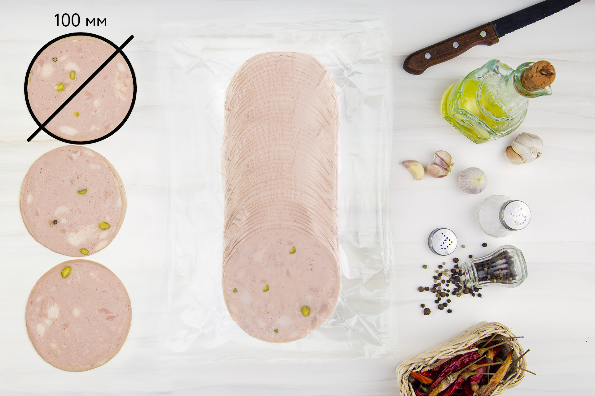 Мортаделла нарезана тонкими ломтиками, которые удобно использовать в приготовлении многих блюд. В составе есть натуральные фисташки и ароматный белый перец, кориандр и перец горошком. Колбаса отлично подойдет для сэндвичей и бутербродов. Она в качестве топпинга украсит пиццу, прекрасно будет смотреться на шведском столе и в составе канапе. Колбаса уже нарезана на слайсы и упакована на профессиональном оборудовании. Это позволяет не тратить время персонала на подготовку продукта к подаче. Быстро, удобно, безопасно!