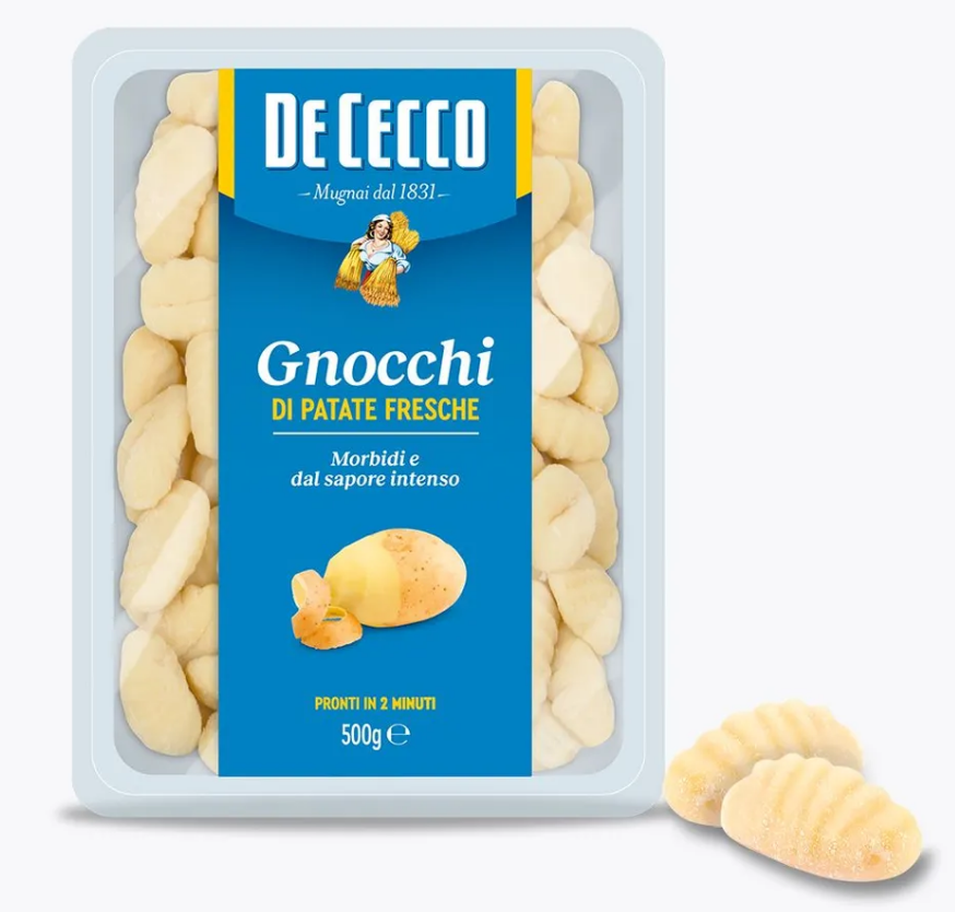Ньокки относятся к семейству сухих фантазийных макаронных изделий, родом из Кампании (Campania), имеют форму пустого рифленого конуса. Эксклюзивный рецепт De Cecco усиливается за счет значительного использования свежего картофеля (80%), что делает ньокки более мягкими и придает им сильный картофельный вкус.