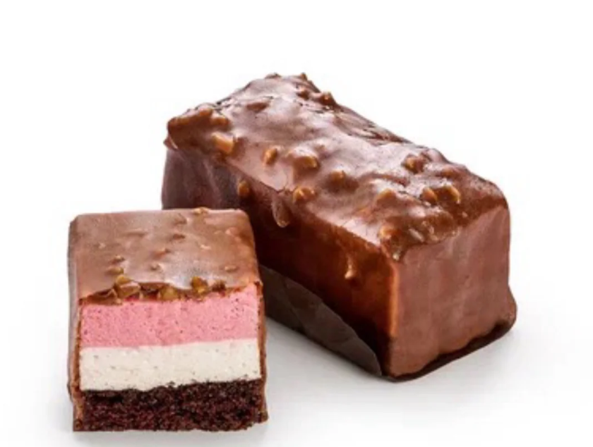 Пирожное на основе шоколадного бисквита, ванильного и малинового мусса, декорированное дробленным жареным арахисом и шоколадной глазурью.